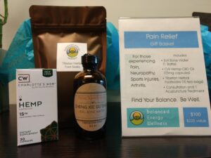 The Pain Relief Gift Basket includes Zheng Xie Gu Shui, also known as “Evil Bone Water” – a Chinese herbal liniment that has been used by martial artists for hundreds of years for sprains, and bruising, as well as muscle and joint pain. I’m also adding Charlotte’s Web Hemp CBD Oil that is useful for pain and healthy recovery from exercise, and the Tibetan Herbal Footsoaks that increase circulation and reduce pain.