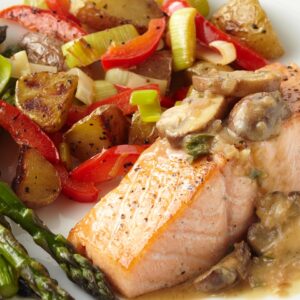 - Place the salmon on serving plates and top with the mushroom sauce. Serve with a side of vegetables.